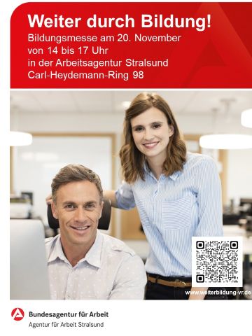 Wir laden alle Interessierten zur Bildungsmesse am 20. November 2025 in der Zeit von 14.00 Uhr bis 17.00 Uhr in der Arbeitsagentur Stralsund, Carl-Heydemann-Ring 98 ein.